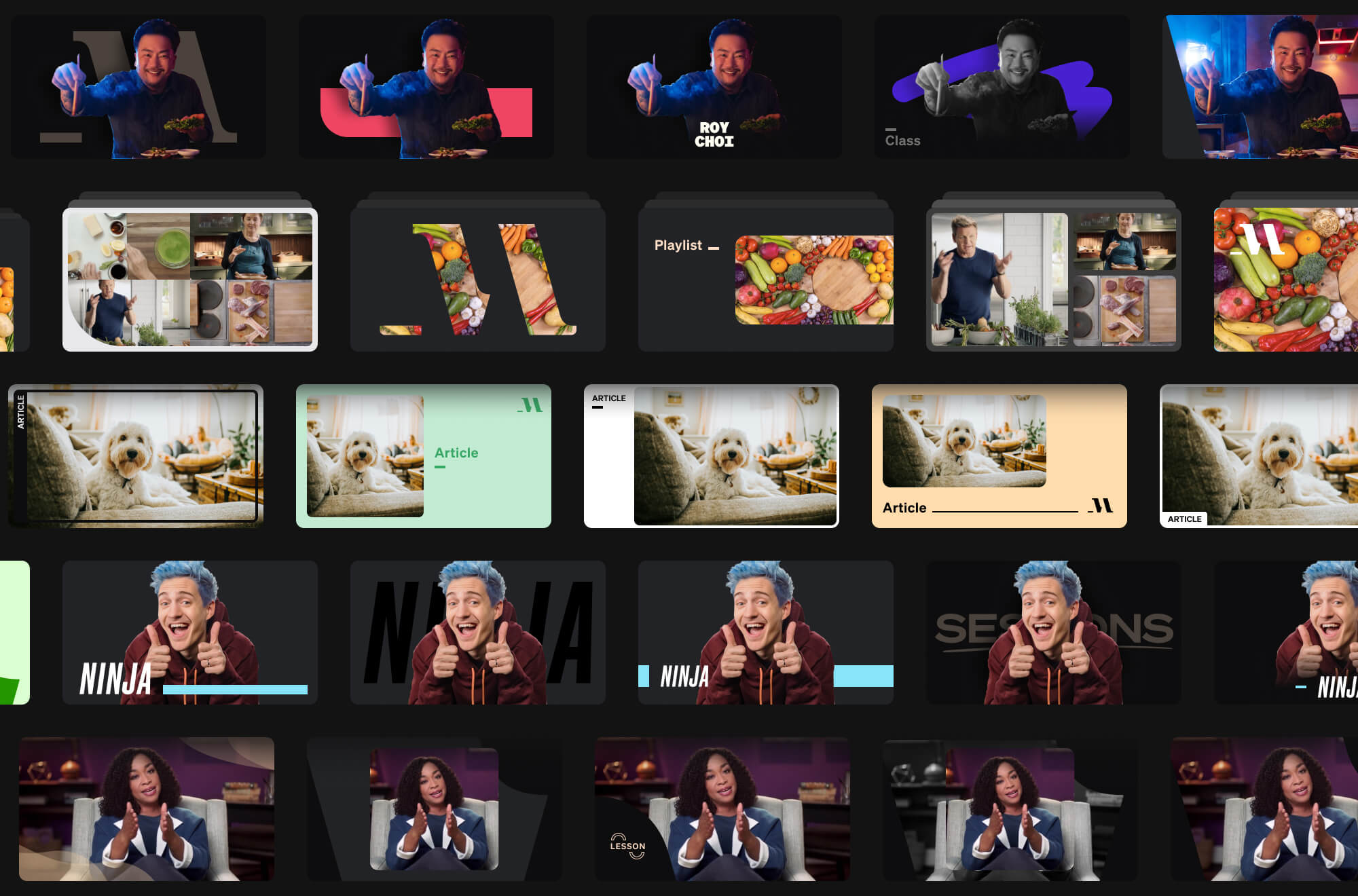 Alex's first project at MasterClass was to develop and explore what a thumbnail art system could be. With the content library containing 5 different media types (class, lesson, session, playlist, and article) and steadily growing, it was important to try and find a visual taxonmy that was more user-intuitive to reduce the reliance on meta info in our cards.